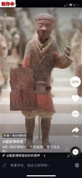 國博發布的短視頻中,“高冷”的陶男俑、陶女俑和說書俑在音樂中“跳起舞來”。手機APP截圖