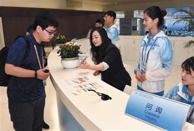 6月1日,志愿者正式上崗,為參會嘉賓、媒體等提供抵離、翻譯、媒體服務、城市運行等全方位、精細化的志愿服務。為了讓志愿服務更加周到貼心,青島還根據志愿者的個人專業、特長和意愿進行了分組。在新聞中心,就有300多名志愿者。