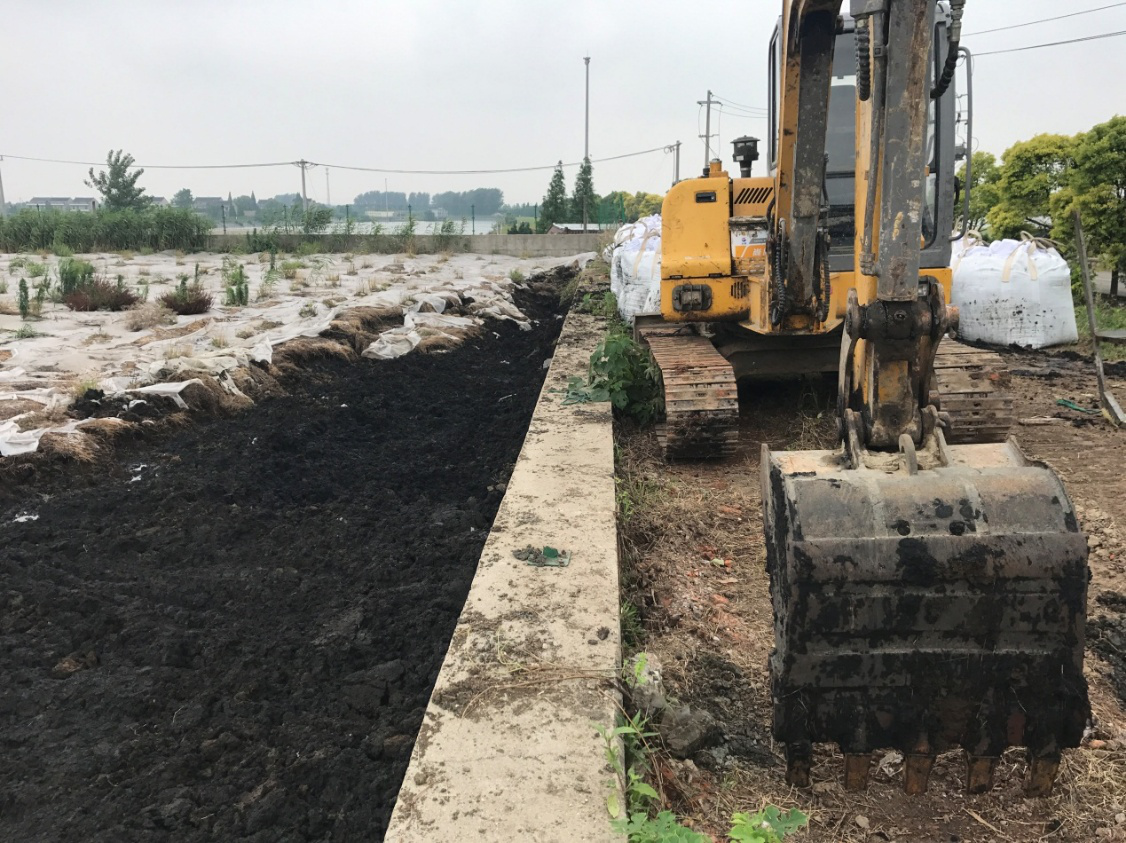 督察人員在南池西側看到停著一臺小型挖掘機,幾十袋包裝好的污泥擺放在旁邊。泰興市工作人員介紹,正在將少量含水率較低的污泥裝袋,運到危廢儲存場所暫存,最終安全處置。但是從現場情況看,挖掘工作才剛剛開始。