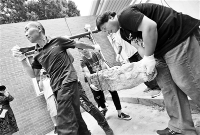 在昨天的文物搬運現場,兩位工人挑擔子,兩位工人用手托住龍頭兩邊,四人費了好大勁才將螭頭搬到車上,開啟“回家”之路。待螭頭到達圓明園后,將有專家對它們進行全身“體檢”,制定修復方案?!斑@些螭頭有一些小裂縫,如果不好好保護,時間久了容易出問題?!眻A明園文物考古科科長陳輝說。(記者 李夢婷)