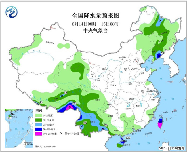 張濤:由于雨帶南移,南方強降水范圍已經減小,因此中央氣象臺13日6時解除暴雨藍色預警,但預計13日8時至14日8時,廣東南部沿海、廣西南部、云南西部和東北部、西藏東南部、四川西部等地有大雨或暴雨(50~90毫米),部分地區并伴有短時強降水,局地有雷暴大風和冰雹。14日以后,廣東、廣西地區降雨整體減弱,華南地區降雨主要集中在雷州半島沿海一帶和海南中北部地區以及南海北部海面上??赡艹霈F伴有短時強降水、雷暴大風或冰雹等強對流天氣。