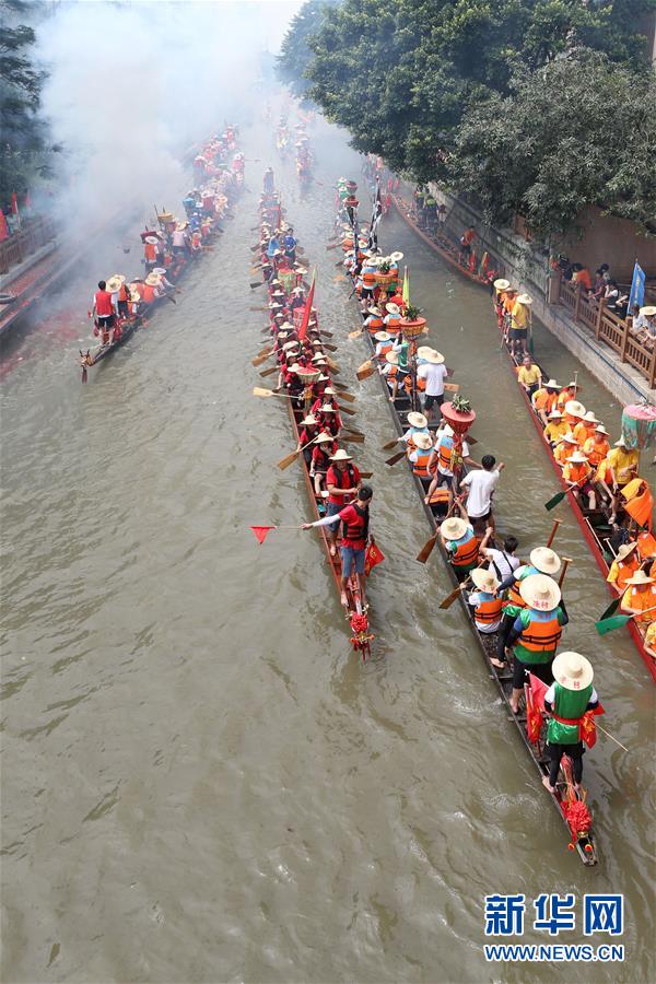 6月14日,多個村的龍舟隊在廣州市天河區一處河道劃龍舟。當日,廣州市天河區舉行一場熱鬧歡快的龍舟活動,來自多個村莊“走親戚”的龍舟隊參加。按廣州的傳統習俗,每年農歷五月初一至初五,各村的龍舟隊要到周圍村落“走親戚”。走親戚的龍舟隊到來時,受訪村子要準備好龍舟飯招待來客?;顒赢斕?,鳴炮敲鑼,一派喜慶氣氛。新華社記者 張加揚 攝