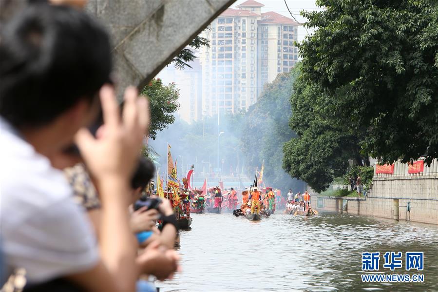6月14日,觀眾在廣州市天河區一處河道旁等待龍舟通過。當日,廣州市天河區舉行一場熱鬧歡快的龍舟活動,來自多個村莊“走親戚”的龍舟隊參加。按廣州的傳統習俗,每年農歷五月初一至初五,各村的龍舟隊要到周圍村落“走親戚”。走親戚的龍舟隊到來時,受訪村子要準備好龍舟飯招待來客?;顒赢斕?,鳴炮敲鑼,一派喜慶氣氛。新華社記者 張加揚 攝