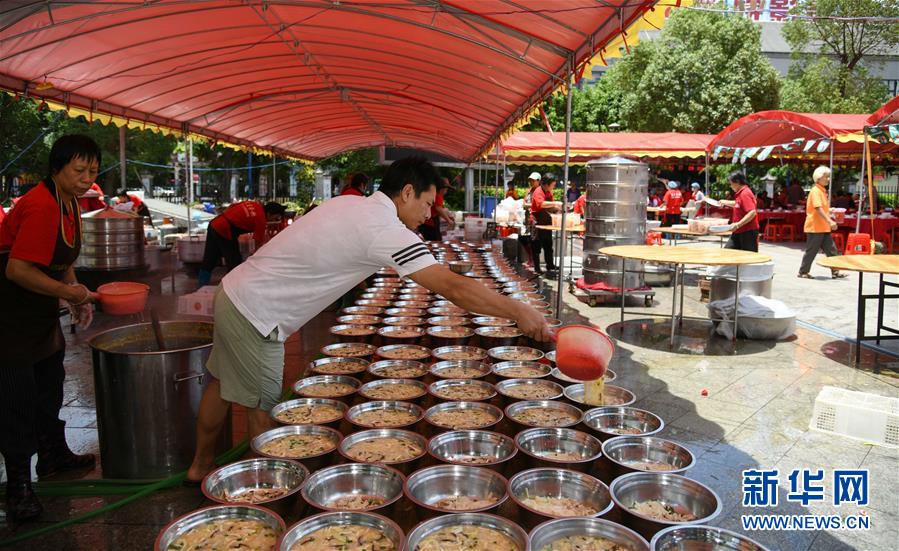 6月14日,工作人員在廣州天河區珠村七夕廣場準備龍舟飯。當日,廣州市天河區舉行一場熱鬧歡快的龍舟活動,來自多個村莊“走親戚”的龍舟隊參加。按廣州的傳統習俗,每年農歷五月初一至初五,各村的龍舟隊要到周圍村落“走親戚”。走親戚的龍舟隊到來時,受訪村子要準備好龍舟飯招待來客?;顒赢斕?,鳴炮敲鑼,一派喜慶氣氛。新華社記者 鄧華 攝
