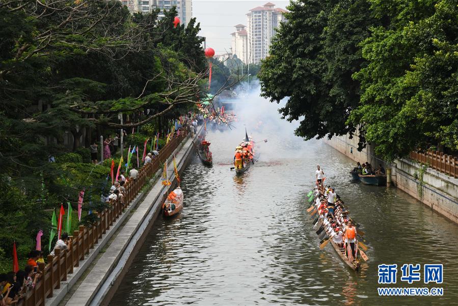 6月14日,多個村的龍舟隊在廣州市天河區一處河道劃龍舟。當日,廣州市天河區舉行一場熱鬧歡快的龍舟活動,來自多個村莊“走親戚”的龍舟隊參加。按廣州的傳統習俗,每年農歷五月初一至初五,各村的龍舟隊要到周圍村落“走親戚”。走親戚的龍舟隊到來時,受訪村子要準備好龍舟飯招待來客?;顒赢斕?,鳴炮敲鑼,一派喜慶氣氛。新華社記者 鄧華 攝