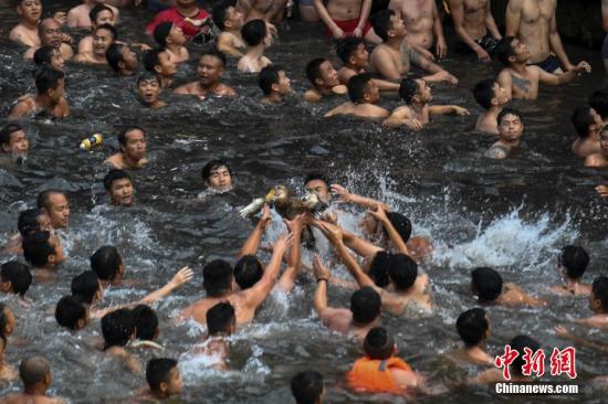 6月18日,正值端午佳節,湖南鳳凰古城沱江河上一年一度的搶鴨子習俗吸引了數萬游人圍觀。楊華峰 攝