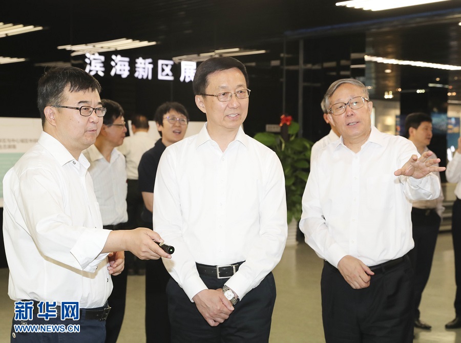 6月19日,中共中央政治局常委、國務院副總理韓正在天津市調研京津冀協同發展工作。這是韓正前往天津市規劃展覽館,聽取天津市總體規劃及有關綠色生態屏障和濕地保護情況匯報。新華社記者 丁林 攝