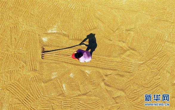 6月19日,河北省遵化市東新莊鎮農民在晾曬小麥。新華社發(劉滿倉 攝)