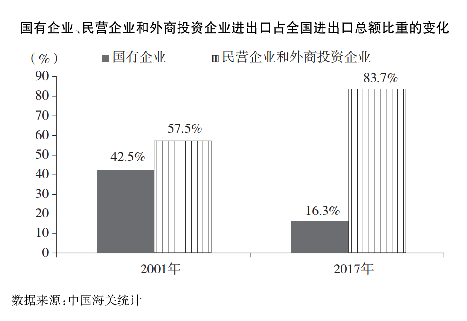 全面放開外貿經營權。促進經營主體多元化,激發各類企業開展貿易的積極性。自2004年7月起,中國對企業的外貿經營權由審批制改為備案登記制,極大地釋放了民營企業的外貿活力,民營企業進出口發展迅速,份額持續擴大,成為對外貿易的重要經營主體。民營企業和外商投資企業進出口占全國進出口總額的比重由2001年的57.5%上升到2017年的83.7%。2017年,作為第一大出口經營主體的民營企業出口占比達46.6%。