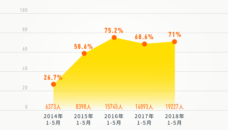 2014年以來,1-5月給予黨紀政務處分人數及其占處理人數比例走勢圖