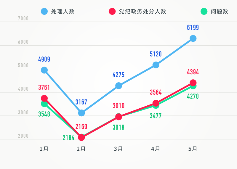 仔細梳理發現,今年1-5月,每月全國查處違反中央八項規定精神問題數、處理人數、給予黨紀政務處分人數相比去年同期均大幅上升。此外,除2月有下降外,1-5月的各項數據呈逐月攀升趨勢。