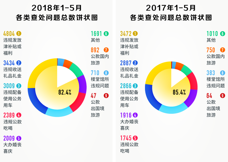 2017年、2018年1-5月各類查處問題總數餅狀圖,違規發放津補貼或福利、違規收送禮品禮金、違規配備使用公務用車、違規公款吃喝、大辦婚喪喜慶等“老問題”占比較大,均超80%