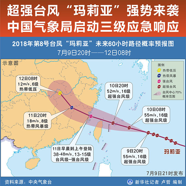 新華社北京7月9日電(記者劉詩平)面對超強臺風“瑪莉亞”強勢來襲,中央氣象臺9日10時發布臺風黃色預警,中國氣象局啟動重大氣象災害(臺風)三級應急響應。福建、浙江、江西、湖南及可能受影響的省級氣象局根據實際研判進入應急響應狀態。