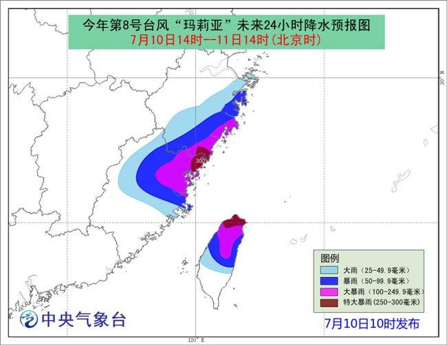 降水預報:10日14時至11日14時,浙江東部和南部、福建中北部、臺灣島中北部有大雨或暴雨,其中,福建東北部、浙江東南部、臺灣島北部等地的部分地區有大暴雨、局地特大暴雨(250-300毫米)。