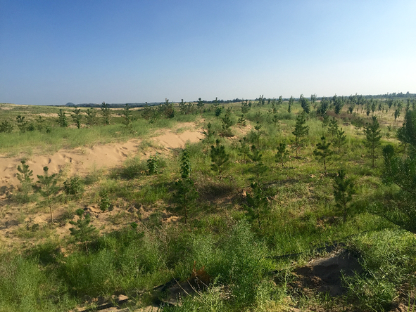 現在正處三北工程第五期階段,王海英說,當下科左后旗所剩余的沙地造林地段,地理位置偏遠,相比以前來說,難度加大。一是交通不方便,以前可以機器造林,現在只能人工用車子拉進沙地。二是以前可以裸栽,現在需帶土容器苗栽培,為了保護好樹根不折斷。三是澆水困難。造林當年需在每三四百畝地之間打一口4—6寸口徑、深二十米左右的井,第二年以后就基本可以依靠雨水了。