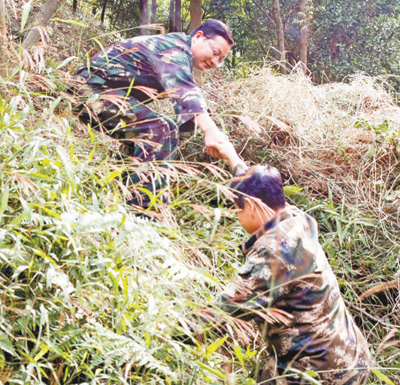 一次,護林員巡山回來報告,一處偏遠林地被人侵占,種了100多棵桉樹苗。許雄堅和工區長騎上摩托車,趕去現場。半道上,十幾個村民攔住他倆,不由分說,推倒摩托車,還持棒威脅說“誰敢動一棵桉樹就打殘誰”。
