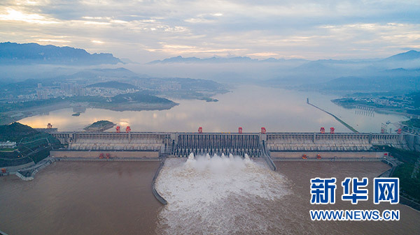 7月13日,三峽大壩開啟泄洪深孔下泄上游來水,騰出庫容。新華社發(鄭家裕 攝)