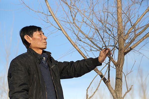在一片2400畝的山坡上,侯貴栽了楊樹、彰子松、油松等鄉土樹種。楊樹壽命是30年,栽后15-20年之間可以伐掉賣木材。但他一直沒舍得伐那些樹,問為啥,他說:“為了給家鄉防風固沙,為了給子孫后代留下一個美好的家園!”