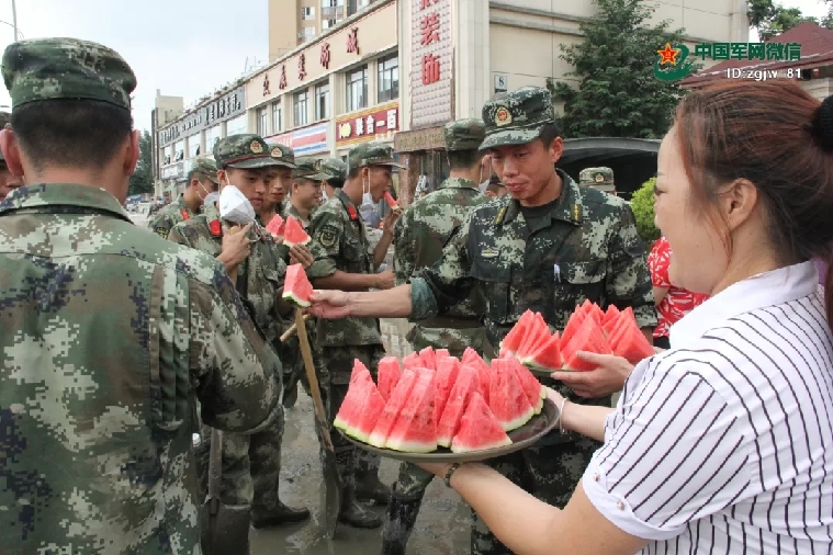 群眾自發為救災官兵送西瓜。劉學功 攝