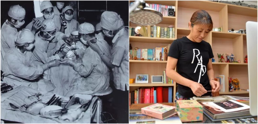 拼版照片:左圖為唐山大地震發生后,上海醫療隊在給傷員做手術(資料照片);右圖為2016年7月24日,“地震嬰兒”孫滬在家中整理老照片(新華社記者 牟宇 攝)。