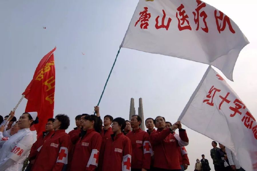 2008年5月13日,一支由80名醫護人員組成的醫療搶險隊從唐山出發,奔赴四川地震災區。新華社記者 鞏志宏 攝
