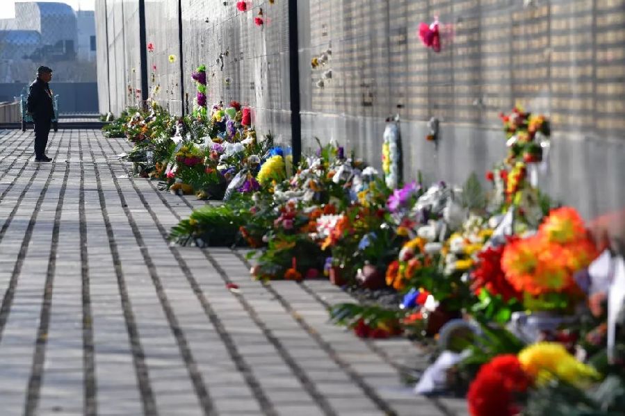 2018年4月4日,一名市民在唐山地震紀念墻前悼念逝者。新華社發(董鈞 攝)