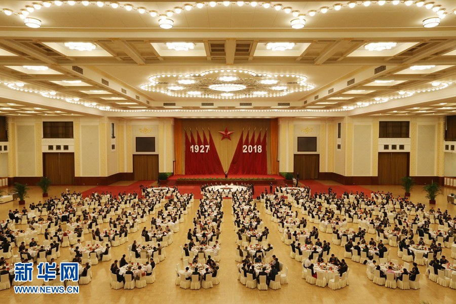 人民大會堂燈火輝煌、鮮花綻放,中外嘉賓歡聚一堂、共慶節日。主席臺帷幕中央懸掛著巨型“八一”軍徽,十面鮮艷的紅旗分立兩側?!?927-2018”醒目的大字熠熠生輝,昭示著中國人民解放軍走過了91年的光輝歲月,走進新時代,踏上新征程。