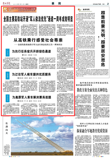 去年8月1日,中國鐵路總公司、軍委后勤保障部聯合決定,在全國鐵路系統開展軍人出行依法優先工作。這項政策實施一年來成效如何?記者走進高鐵站進行了采訪調查,實地探訪“軍人依法優先”給官兵出行帶來的新變化。請關注今天出版的《解放軍報》的報道——