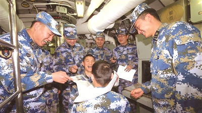 某潛艇支隊立足“百人同操一桿槍的現實”,堅持踐行群眾路線、密切聯系官兵。圖為該支隊某艇員隊副政委徐建鵬和戰士們一起開展“龍宮游戲”,以緩解深海長航帶來的巨大心理壓力,為艇員們保持良好備戰狀態增添動力。茆 琳攝