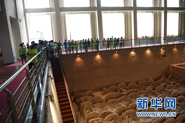 在位于曲沃縣曲村鎮的晉國博物館,來自山西省臨汾市的學生在參觀車馬坑遺址(7月31日攝)。 新華社記者 楊晨光 攝
