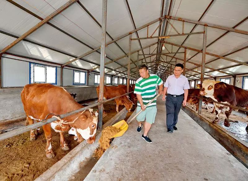 吉林省磐石市煙筒山鎮大黑山村駐村第一書記闞閱(右)在了解大黑山村肉牛飼養情況 張楠攝/ 本刊