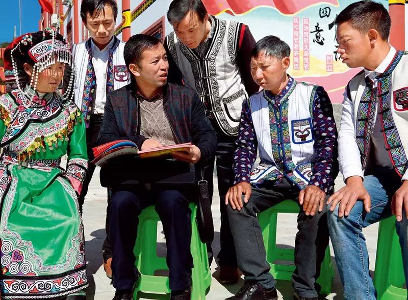 貴州省六盤水市鐘山區大灣鎮海嘎村駐村第一書記楊波(前左二)向海嘎村彝族村民宣講十九大精神 劉續攝/ 本刊