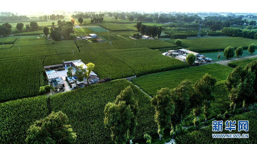 陜西榆林市靖邊縣東坑鎮新建村綠色包圍中的農家小院(7月31日無人機拍攝)。新華社記者 陶明 攝