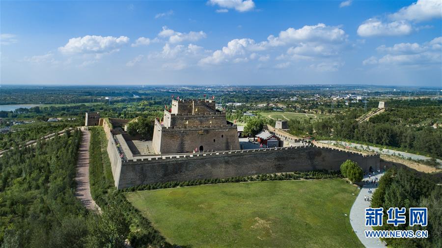 藍天白云映襯下的榆林市鎮北臺(8月1日無人機拍攝)。新華社記者 陶明 攝
