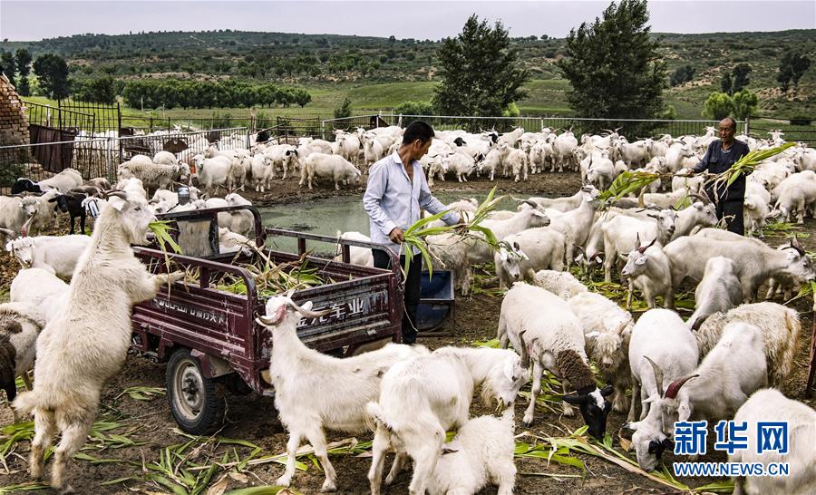 陜西榆林市靖邊縣紅墩界鎮長勝村村民在圈舍中喂羊。陜北推行的“封山禁牧,舍飼養羊”政策,有效保護了草地(8月1日攝)。新華社記者 陶明 攝