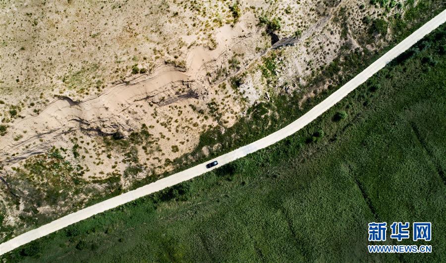 一輛汽車行駛在榆林市橫山區沙漠治理與未治理的分界公路上(8月4日無人機拍攝)。新華社記者 陶明 攝