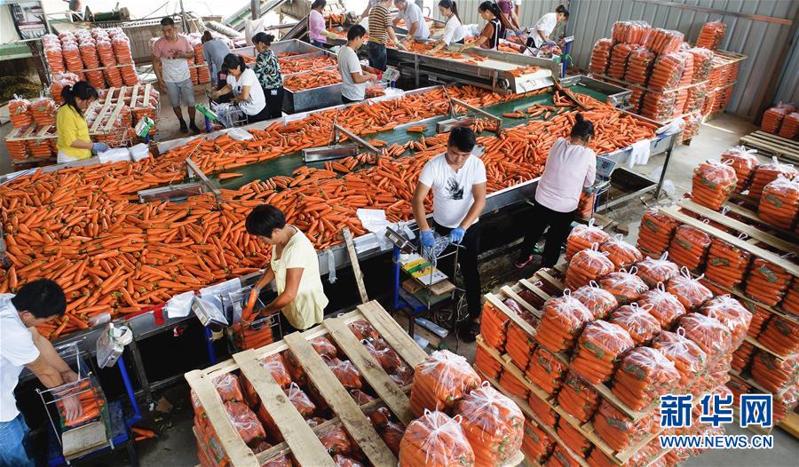 陜西省榆林市靖邊縣永國蔬菜種植農民專業合作社的村民們在分挑胡蘿卜(7月31日攝)。靖邊縣利用沙土地的優勢,發展蔬菜生產助村民增收。新華社記者 陶明 攝