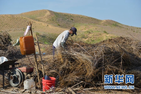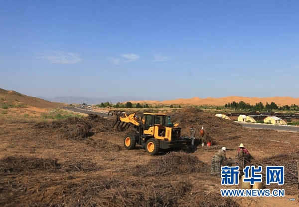 在內蒙古鄂爾多斯市杭錦旗,工人為新修的穿沙公路制作沙障(7月26日攝)。新華社記者 鄒予 攝