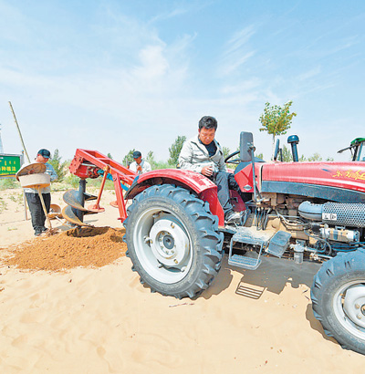在庫布其用虹吸種植法植樹。記者 吳 勇攝