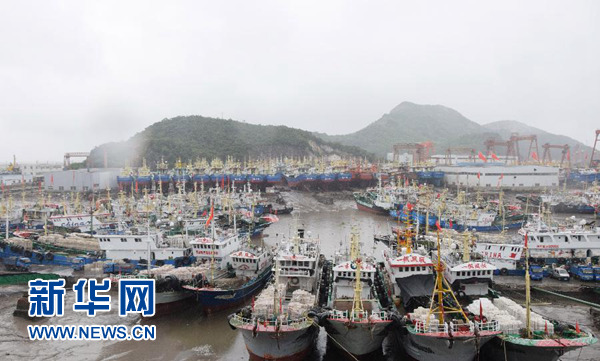 8月12日,大批漁船??吭谡憬貛X市松門鎮礁山碼頭避風。 新華社發(陶文彪 攝)