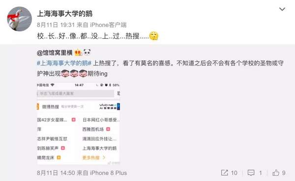 11日,“上海海事大學的鵝”還在微博上驕傲地說,校長好像都沒有上過熱搜,我們已經上了,還配了一張“上海海事大學的鵝”登熱搜的截圖。