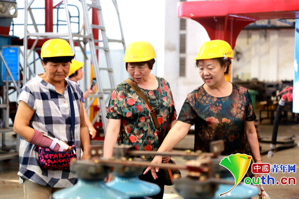 2018年,侯愛華、胡學政、白燕娥(從左至右)參觀現代化鐵路車間。中國青年網見習記者 李慧慧 攝