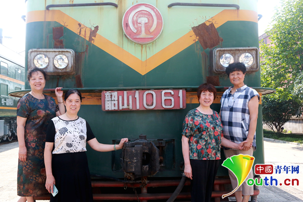 2018年,中國第一代電力機車女司機白燕娥、楊憲美、胡學政、侯愛華(從左至右)在曾經駕駛過的機車前留影。中國青年網見習記者 李慧慧 攝