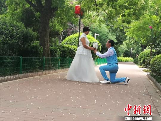 “結婚這么多年,老伴經常念叨,說我不夠浪漫,從不給她過情人節,今天我不僅陪她過了節還補拍了婚紗照,以后我也要跟年輕人學學,經常給老伴送花送禮物?!笨粗┗榧喌睦习?,68歲的王在民老人笑得一臉幸福。