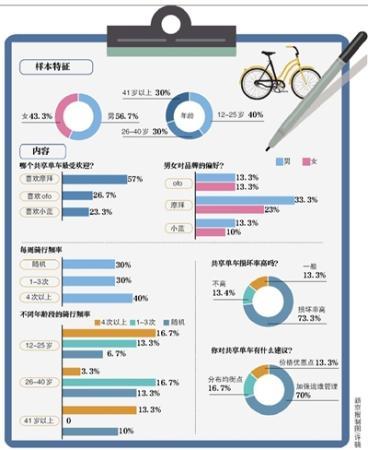 近日,新京報記者在北京前門、國瑞城、百子灣以及天通苑等商圈、地鐵站附近隨機采訪共享單車用戶,就共享單車騎行體驗、運維管理等情況進行調查。此次共隨機采訪30位用戶,包括不同性別的青少年、青年、中年等年齡段用戶,涵蓋了學生、上班族、游客等多種人群。