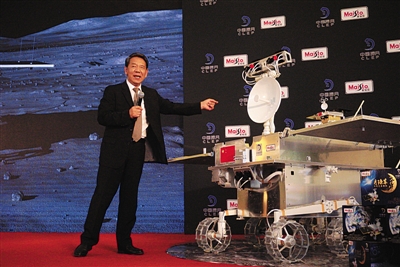昨日,中國工程院院士、中國探月工程總設計師吳偉仁介紹嫦娥四號月球車外觀和設計。記者 倪偉 攝