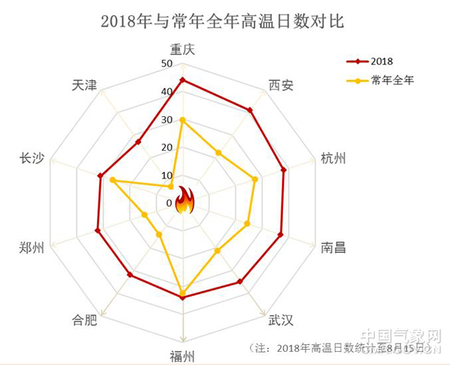我們統計了2018年省會級城市的高溫日數,截至8月15日,省會級城市高溫日數排在第一的是重慶(44天),其次為西安(41天)、杭州(38天)、南昌(37天)和武漢(35天)。多數城市的高溫日數比常年全年高溫日數偏多10天以上,其中西安和天津比常年全年分別偏多19天和19.9天。