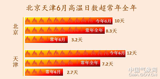 北京、天津6月高溫日數超常年全年。 王美麗 制圖