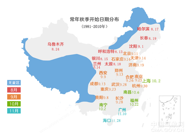 飽受今夏“炙烤”之苦的網友都在盼望著秋天的到來。近期受冷空氣的影響,北方一些城市早晚已經能感受到秋天的絲絲涼意,那么真正的秋天還有多遠?氣象學上通常以5天滑動平均氣溫穩定低于22℃的開始時間為秋季開始。從常年平均來看,8月份能進入氣象意義秋季的也只有西北和東北少數城市,我國大部分地區還需要等到9月份才能進入秋季,而華南沿海和海南,入秋則要等到11月甚至12月。目前來看,近期的幾股冷空氣有可能推動黑龍江、吉林、內蒙古一帶入秋,但南方的小伙伴還要多等一些時日。