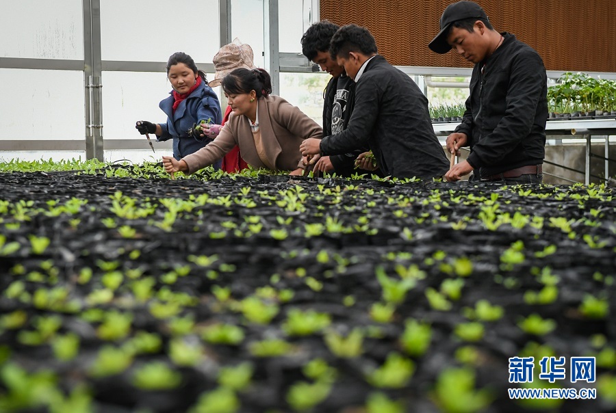 西藏山南市扎囊縣阿扎鄉群眾在藏草萬畝苗圃基地內栽培幼苗(7月23日攝)。 新華社記者劉東君攝
